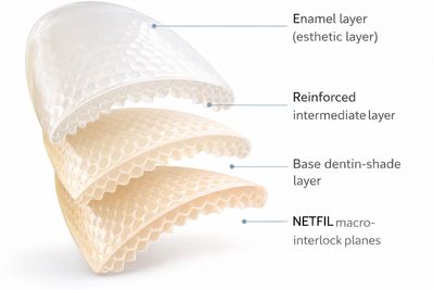 The NETFIL Mesh Tool introduces macro-mechanical keys between the composite layers that are far less sensitive to strain-rate limitations. These interlocking features help distribute stresses more uniformly and fundamentally reduce the interlayer shear compliance when loads occur rapidly. Instead of concentrating stresses at localized points, forces are shared across mechanically engaged layers, thereby improving the damage tolerance of the veneer under high-strain-rate conditions. The objective of our Netfil Mesh approach is to enhance the ability of the veneer structure to withstand bending and shear stresses when loading occurs rapidly or unexpectedly during clinical function.